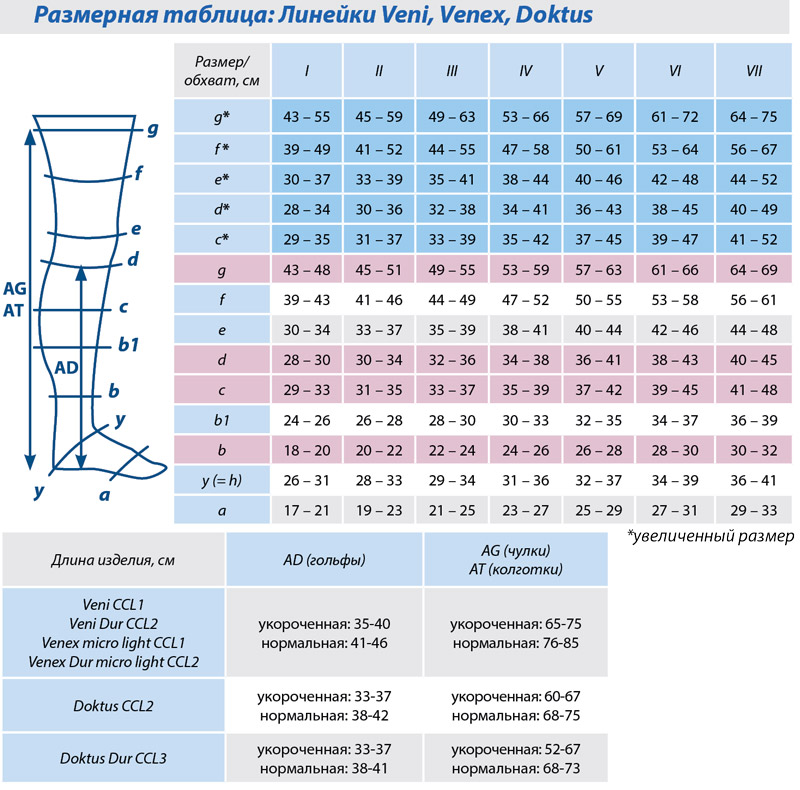- нормальная – 41-46 см (гольфы Veni, Venex), 38-42 см (гольфы Doktus), 76-85 см (чулки, колготки Veni, Venex), 68-75 (чулки, колготки Doktus)