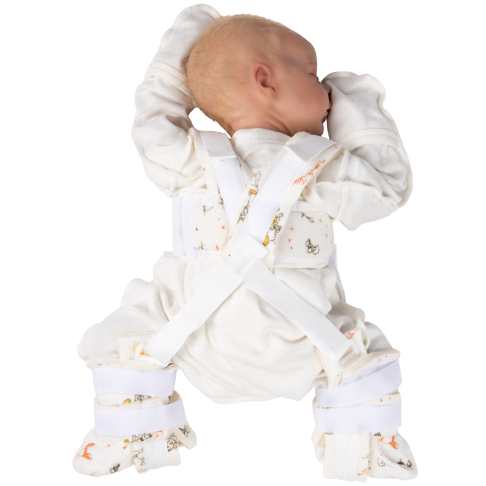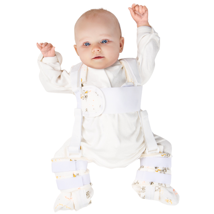 - отрегулируйте степень натяжения ремней на «ботиночках» так, чтобы бедра ребенка находились в положении сгибания и отведения