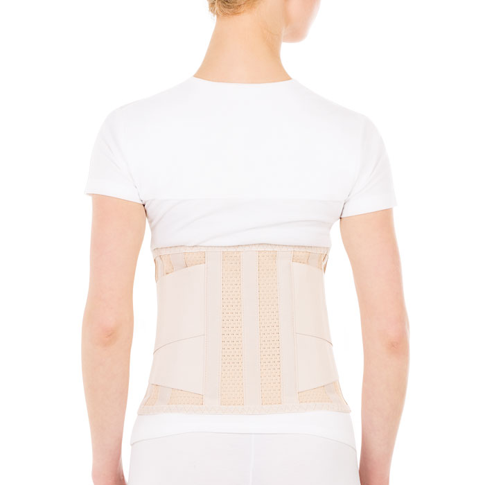 Надеть корсет на нижнее белье, лежа на спине. Ребра жесткости должны располагаться посередине поясничного отдела позвоночника на одинаковом расстоянии от позвоночного столба. Зафиксировать застежку корсета на животе, отрегулировать степень фиксации с помощью дополнительной стяжки. Ребра жесткости моделируются врачом согласно анатомическим особенностям пациента. Длительность ежедневного использования определяется лечащим врачом.