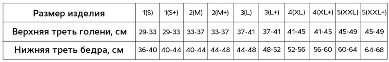 - Размер коленного бандажа выбирается согласно таблице подбора изделий по верхней трети голени и нижней трети бедра
