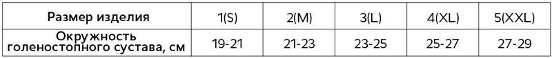 - Размер бандажа выбирается согласно таблице размеров изделий по окружности голеностопного сустава (измеряется над лодыжками)